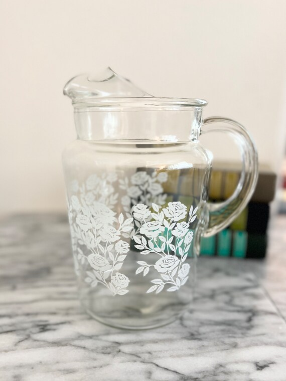 Vintage Glass Pitcher With Frosted White Rose Design 9 Etsy